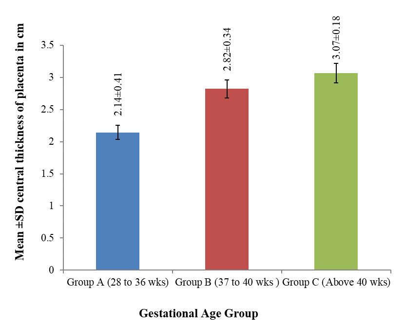 Result: The mean central thickness was maximum in group C (3.07 cm) and was minimum in group A (2.14 cm). It was also observed that the mean thickness at center of the placenta increased with gestational age. The mean difference of the placental thickness at the center between groups A and B and A and C was statistically highly significant (p < 0.001) but difference between B and C was statistically moderately significant (p < 0.01).