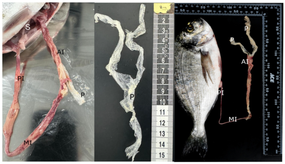 To our knowledge, this is the first documented case of a cultured seabream of 300 mm in total length had ingested a clear plastic fragment with a length of > 150 mm. The upper and part of the middle intestinal segments were nearly occluded and severely damaged. The consumption of such a large plastic fragment suggests that this was either an accidental ingestion or the fish exhibited behavior indicative of linear foreign body ingestion. While the duration of the plastic's presence in the intestine is unknown, it likely had not been there for long, as the observed intestinal obstruction, though significant, but it might be incomplete. Obstruction of digestive tract might lead to a false feeling of satisfaction which ends with starvation and death [8]. Most previous studies investigating plastic ingestion in demersal and pelagic fish species classified the ingested plastics as microplastics or macroplastics. However, these studies either did not specify the dimensions of the macroplastics [9], or with a length of >25 mm [7, 10], which are considerably much smaller compared to the size of the plastic sheet (>150mm) ingested by the fish in our case study with only a total body length of 300mm. The severe damage observed in the intestinal villi, submucosa, and mucosa of the anterior intestinal region in the current study is likely attributable mainly to the physical injury. In general, the ingestion of plastics, particularly microplastics, has numerous detrimental effects on fish. These include increased mortality, reduced predatory performance, neurotoxicity and oxidative stress [1], and severe intestinal damage with reduced food intake, or complete loss of appetite [11-12]. The inflammatory conditions observed in the intestine, characterized by extensive de-epithelization, blood vessel ectasia, and congestion, along with widespread leukocyte infiltration, have been previously documented in laboratory studies over a long period of ingestion. For example, European sea bass (Dicentrarchus labrax) showed these symptoms after being fed microplastics for 60-90 days [11]. Similarly, zebrafish (Danio rerio) and intertidal fish (Girella laevifrons) exhibited similar inflammatory responses after 10, and 45 days, respectively, of microplastic exposure [12, 13].