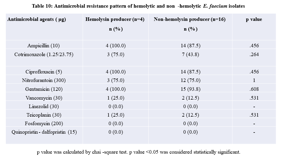 Eighty percent of hemolytic E. faecalis isolates were resistant to ciprofloxacin and gentamicin. Significant association was found in case of ampicillin, ciprofloxacin, nitrofurantoin and gentamicin resistance and hemolysin production in E. faecalis (p< .05). Hundred percent of hemolysin producing isolates of E. faecium were resistant to ampicillin, ciprofloxacin, gentamicin and 75% isolates were resistant to cotrimoxazole and nitrofurantoin but this association was not statistically significant [Table-9 and Table-10