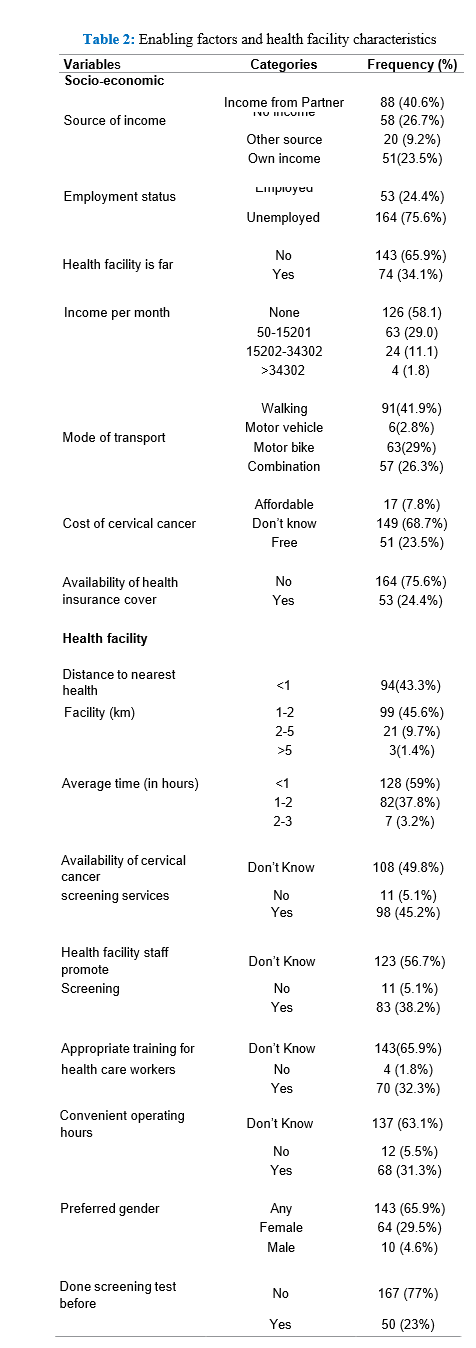The study's participation rate was 100%, with 217 women. Table 1 provides an overview of sociodemographic traits and awareness about cervical cancer and screening. The majority of participants in the research were from Mariakani Cervical cancer screening can detect (32.7%) and Christians (79.3%). The common age group